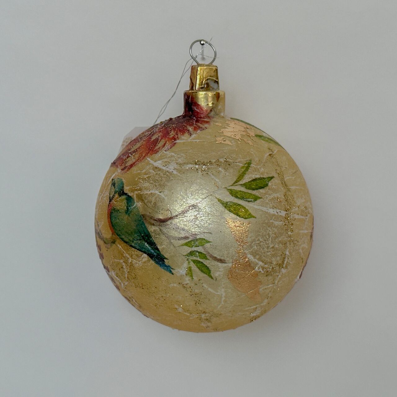 このボールオーナメントは、緻密な描写で表現された藤とダリアの美しさがあります。さらに青い鳥が可愛らしく飛んでいる様子も表現されています。マットタイプの仕上げが高級感を演出し、お部屋のアクセントにも最適です。